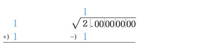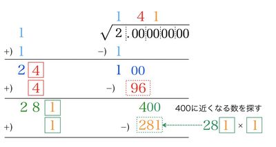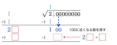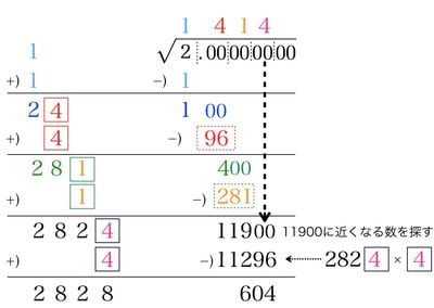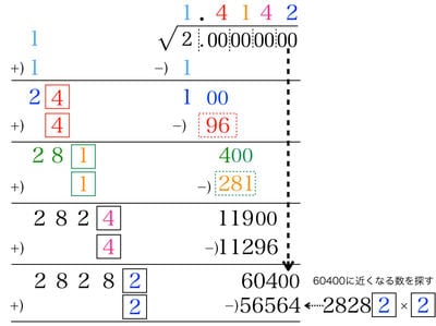 このように当たりをつける計算方法では、2乗した値が2を挟むことを確認しながら√2の値が1桁ずつ算出されていきます。