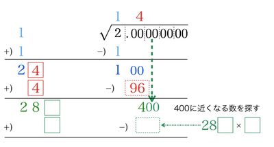 ステップ5.以下ステップ3とステップ4を繰り返していきます。左側24+4=28、右側100-96=4と計算して「28」「400」と書きます。