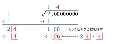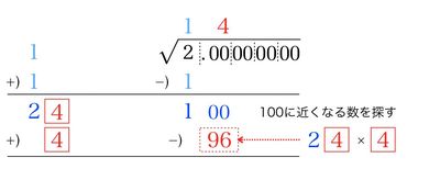 ステップ4.√の中の「00」を下に降ろします。左側を「2□」として2□×□が100以下になる最大の整数□を求めます。24×4=96なので□には「4」が入ります。「4」を□部分と√の上にに書きます。