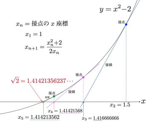 同じように、y=x2である放物線上の接線を求め、この接線のx切片をx3とします。このように接点、接線、x切片xnを逐次求めていくとき、x切片xnが√2に限りなく近づいていきます。