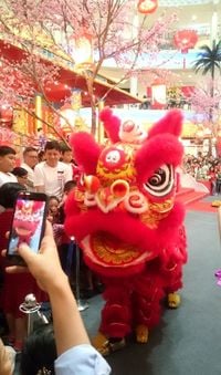 春節の風物詩の「ライオン・ダンス(獅子舞。中国語:舞獅)」。「招福駆邪」の縁起物で、銅鑼の音とともに登場し、派手な演奏をバックに、豪快、華麗な舞で新年を彩る(筆者撮影、以下同)