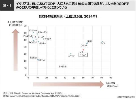 イタリアは人口およそ6000万人、欧州連合(以下EU)加盟国の中でドイツ、イギリス、フランスに次ぐ規模の大国です。ところが、図-1が示す通り、1人当たりGDPで言えば北欧諸国が圧倒的に上を行き、イタリアは約3万5000ドルで中位レベルにとどまっています。