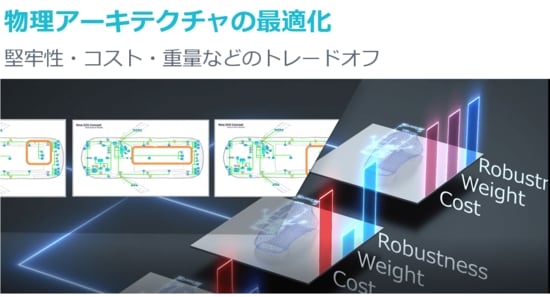 早乙女:もう一つ、我々がクルマの電装やワイヤハーネス設計に携わっている方々にお伝えしたいのは、これからのクルマづくりにおける「堅牢性」や「コスト」、「重量」などの改善にとって、増加する車載電装システムの配置・配線を最適化することの必要性です。