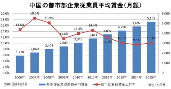 上の図は、2006~2015年における中国全土の都市部企業従業員の平均賃金と、インフレ率を除外していない前年比名目賃金上昇率をグラフ化したものです(データは国家統計局調べ。平均賃金の元データはボーナスなどを含む年収額ですが、図では月額で分析するため元データを12分した数字でまとめています)。