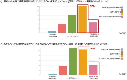 この働き方についての意識調査の結果、経営者の57%が従業員に対して「自己管理による能動的な働き方」を期待しており、従業員の49%も「自己管理による能動的な働き方」を理想的だと回答した。