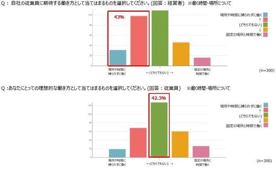 しかし、働く「時間」「場所」についての調査では経営者の43%が「場所や時間に縛られずに働く」ことを期待しているのに対し、従業員側の回答は「場所や時間に縛られずに働く」でも「固定の時間、場所で働く」でもなく、「どちらでもない」が42.3%を占める結果となった。