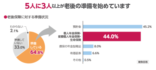 「何らかの自助努力が必要と言えます。『平成28年度生活保障に関する調査』では、老後保障に対する準備状況についても尋ねています。それによれば、64.8%が、預貯金、個人年金保険・変額個人年金保険や生命保険、損保の年金型商品、有価証券などを利用して準備していると答えています。中でも、その手段として個人年金保険や生命保険などを選んだ人が44.0%に達しています」(藤井氏)。