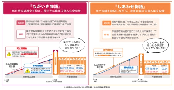 その点で、『しあわせ物語』はいわば、死亡保障を確保しながら老後に備える年金と言える。一方、『ながいき物語』は、解約返還金を抑えている分だけ、生存重視の年金である。