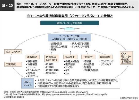 ボローニャのパッケージングバレーには実は「コーディネーター企業」というものが存在し、市販部品、特殊部品、部品加工、組み立て、制御調整など各分野を担う企業を取りまとめて、世界市場の窓口としての重要な役割を果たしています(図-20)。