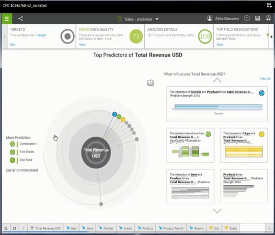このように、企業の目標を達成するためのKPIに対して、Planning Analyticsでは現在の状況をスコアカードで簡単に確認することができる。ワーニングが出た部分について、予実差を埋めるためのアクションプランを検討したり、必要に応じて修正計画を立てることも可能だ。その際に役に立つのが、Watson Analyticsとの連携によりその理由を深掘りできる機能だ。