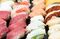 握りずし。ワサビを利かせ醬油をつけて食べる。すしの系譜の中で江戸時代に誕生した。