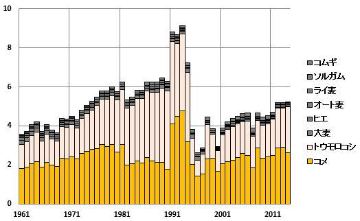 図1 北朝鮮の穀物生産量(単位:100万トン、出典:FAO)