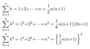 自然数のべき乗をたし合わせる公式は総和公式と呼ばれます。高校数学の教科書に登場するのは次のようなΣを用いた公式で、数列の部分がkの1乗、2乗、3乗である場合です。