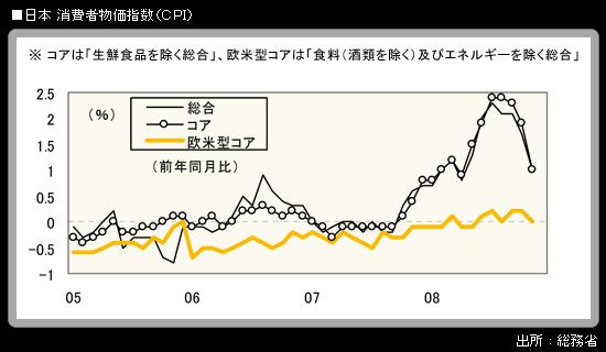 日本では、CPIのうち、日本流のコア(生鮮食品を除く総合)が2008年7・8月に前年同月比+2.4%でピークをつけた後、11月には同+1.0%までプラス幅縮小。2009年5月にはマイナスに転じる見通し。欧米型コア(食料<酒類を除く>及びエネルギーを除く総合)は、前年同月比0%近辺で低位安定を続けており、今後は景気悪化を背景に、マイナス圏に沈んでいくと予想される。