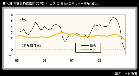 米国では、CPI総合が2008年7月に前年同月比+5.6%でピークをつけた後、12月には同+0.1%まで鈍化。次回2009年1月分ではマイナス転落の可能性が高い。コア(食品・エネルギーを除く総合)は、2008年12月が前年同月比+1.8%。節目の+2%を割り込んだが、これは2004年8月以来のことである。