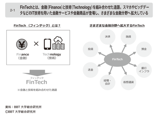 FinTechとは、Finance(金融)とTechnology(技術)を融合させた造語で、具体的にはスマートフォンやビッグデータなどのITを用いた金融サービスや金融商品の登場を指しています(図2-1)。ここにきてFinTechが注目されるようになった理由として、ブロックチェーンやビットコインといった、既存モデルとは異なる技術が開発されたことが挙げられます。