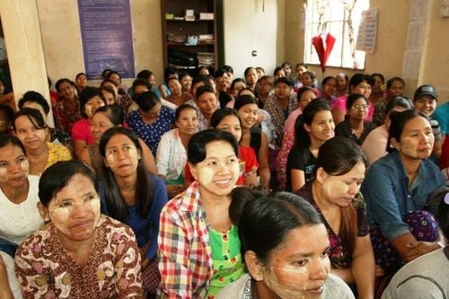 週に1度の融資日に支店に集まった顧客たち(左)にあいさつするMJIの加藤さん(2016年12月、トンティ村で撮影)