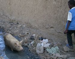 ゴミにあふれる水たまりをあさる豚を見つめる中央アフリカの少年