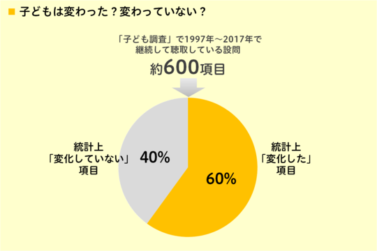 1997年から2017年まで継続して聴取している「子ども調査」の質問項目は約600項目。そのうち、1997年と2017年のスコアを比べた時に、統計上「変わった」と言えるほどスコアが変化したものが約6割、統計上「変わった」とは言えないものが約4割となりました。