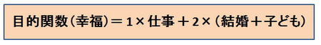 式の解説:幸福には「仕事」と「結婚・子ども」それぞれの充実が必要で、その割合は「結婚+子ども」が仕事より2倍高い(幸せへの貢献が大きい)。一方、私はどうやらモテない。職場も男ばかり・・・オワタ\(^o^)/