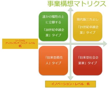 右の「事業構想マトリクス」をご覧いただきたい。「ソーシャル・アントレプレナーシップ(=社会起業家精神)・レベル」と「イノベーション・レベル」の2軸を取ると、4つの象限に分かれる。