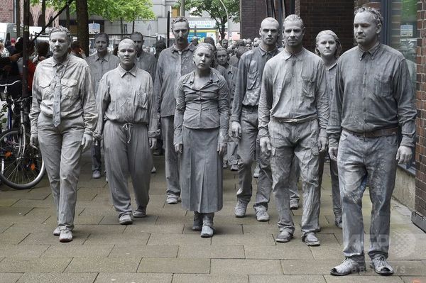 Performers smeared with clay demonstrate during the art action "1000 Gestalten" on July 5, 2017 on a street in Hamburg, northern Germany, where leaders of the world's top economies will gather for a G20 summit./AFP PHOTO/Christof Stache