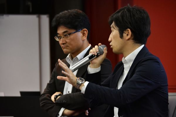7月3日、ライフサイエンス・イノベーション・ネットワーク・ジャパン(LINK-J)が開催したネットワーキング・ナイトで登壇した正林和也さん(右)と大下創さん(左)