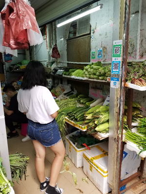 こんな庶民的な市場でも、近所の奥さんがスマホ決済で買い物(広東省広州市内で筆者撮影)