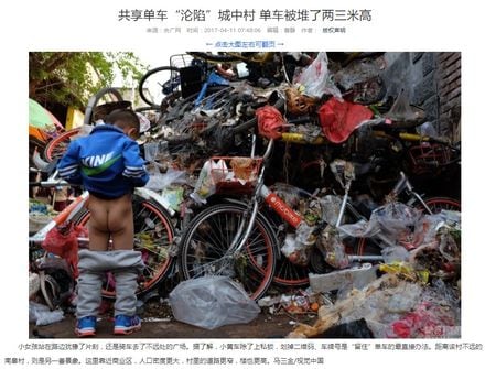 最新技術の匂いがするシェア自転車がゴミ柵に。そこに立ちションする子ども・・・。このギャップが現代の中国である。現地報道より