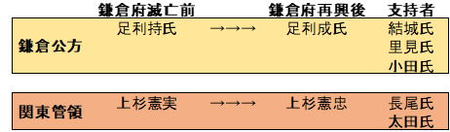 こうして再興された鎌倉府でしたが、案の定というか、内部では旧来の鎌倉公方家を支持する結城氏、里見氏、小田氏からなる「(足利)成氏派」と、鎌倉公方の補佐役である関東管領家(上杉家)を支持する長尾家、太田家からなる「(上杉)憲忠(のりただ)派」が拮抗し、領地や後継者氏名などでことごく意見が対立します。