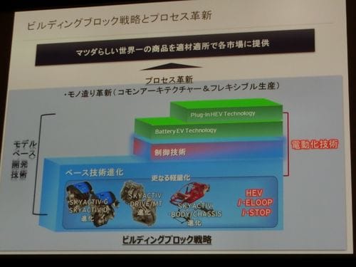 マツダの次世代パワートレインの導入計画。マツダの記者会見場にて筆者撮影