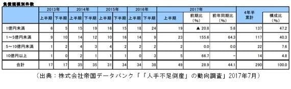 同社では“従業員の離職や採用難等で人手を確保できなかったことが要因となって倒産(法的整理)した企業(負債1,000万円以上、個人事業主を含む)”を「人手不足倒産」と定義しており、この前提に沿った「『人手不足倒産』の動向調査(2013年1月~2017年6月)」を発表した。調査によると、調査対象期間の人手不足倒産の累計は290件。半期別で比較した場合、2017年上半期は49件で、調査開始当初の2013年上半期(17件)と比較すると、4年で2.9倍に増加した。