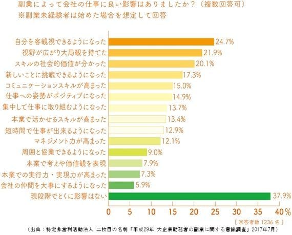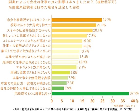 社員の成長機会や企業の魅力増に 副業を始めた社員の中には、社外で新たな経験を得て本業への好影響を実感している人もいる。「自分のことを客観的に見ることができるようになった」(24.7%)、「視野が広がり大局観をもてるようになった」(21.9%)、「自分のスキルの社会的価値が分かった」(20.1%)といった前向きな回答が寄せられた。