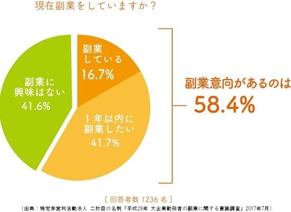 NPO法人二枚目の名刺は、従業員1000名以上の国内の大企業の正社員1236人に対し 「平成29年 大企業勤務者の副業に関する意識調査」を行った。それによると、現在副業をしている社員は16.7%、1年以内に副業に取り組んでみたい社員は41.7%と、合計約6割に上り、社員側の副業志向の高まりがうかがえる。