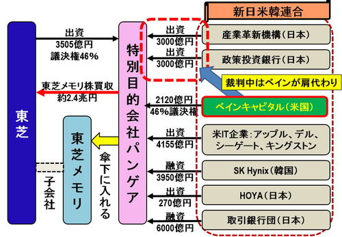 「新日米韓連合」には、ベインを中心として、米アップル、米デル、米シーゲート・テクノロジー、米キングストンテクノロジー、韓国SKハイニックス(SK Hynix)、日本のHOYA、産業革新機構、日本政策投資銀行が加わっている(図1)。これらが、「パンゲア」と名付けられた特別目的会社に出資や融資を行い、東芝本体も3505億円を拠出して、東芝メモリを2.4兆円で買収する計画である。