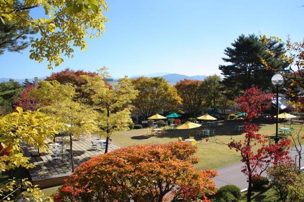 秋が深まると伊那食品工業の本社も紅葉が美しい。