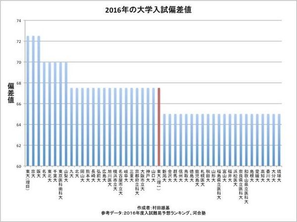 図1:国公立大学および東大理1の偏差値(2016年度入試、河合塾のデータから)
