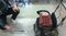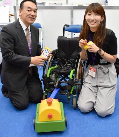 国際医療福祉機器展で『B-GO』を展示する武智あかねさん(別府発達医療センター理学療法士)と相原茂さん(ブライテック技術開発部部長)