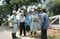 木製の遮断機の脇で踏切警手の男性に聞き取り調査をする小倉さん(左端)と稲田さん(右から2人目)