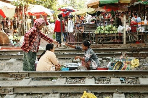 線路の上で魚を売る女性(マンダレー駅付近で2015年11月撮影)