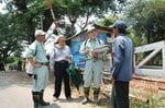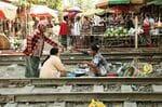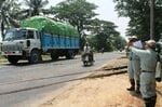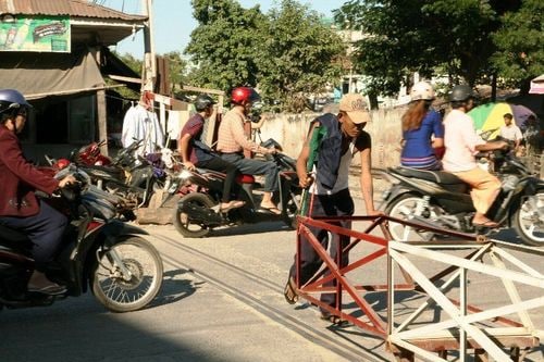 踏切柵を引き出す警手の横を二輪車が次々と通り抜けていく(マンダレー市内で2015年11月撮影)