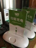 北京市内の喫茶店に置かれた、無慈悲なリストラを決行中の「HI電」のシェア充電器。同店舗内には「街電」と「小電」の充電器も置かれて3社でバトルしていたが、有料の充電ニーズがそこまで多いわけがない(筆者撮影)