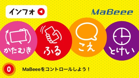 スイッチのオン/オフでしか動作を制御できないはずの自動車や電車の玩具が、スマートフォンの傾きや振りの強弱に合わせてスピードを変えながら走る。MaBeeeに内蔵した電子回路が出力制御やBluetooth通信の機能を備え、スマートフォンと通信して乾電池の出力を調整する仕組みになっている。