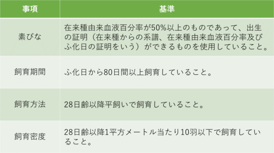 市場を占めている鶏のほとんどは外国種だが、それに対し日本鶏の血統が50%以上占めているのが「地鶏」で、日本農林規格(JAS)で定めた4つの条件を満たしたものをいう(下の表)。ただし、これは商業上の呼称で、品種としての地鶏とは別物だ。名古屋コーチンや比内地鶏はこの商用地鶏だ。