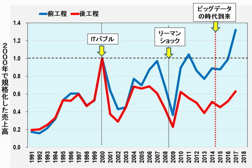 図2 2000年で規格化した前工程と後工程の装置市場推移出所:電子ジャーナル『半導体データブック』『半導体製造装置データブック』、筆者の調査による