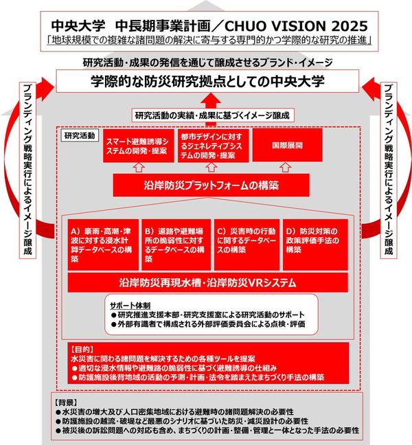2017年度に選定された「災害適応科学プラットフォーム開発プロジェクト」(代表者:理工学部教授 有川太郎氏)は、災害時における避難や防護施設の脆弱性および地域活動の持続性や将来性を踏まえたまちづくり手法の提案を目標に、洪水や津波による浸水、構造物の脆弱性、避難行動、人口予測、および災害に関わる法律などをデータベース化し、それらを自由にかつ便利に利用できるプラットフォームの構築を目指している。
