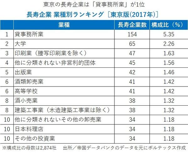 実際、東京で100年以上続く長寿企業の中で一番多い業種は貸事務所業なんです。日本全体では酒造業なのですが、東京では貸事務所業が一番多い(下表を参照)。ただし、最初から貸事務所業だったのではなくて、副業がいつのまにか本業に取って代わった場合が多いんです。いかに不動産賃貸業の継続性が長いかを雄弁に物語っているのではないでしょうか。