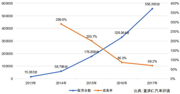2017年における新エネ車の世界販売台数は前年比58%増の約122.3万台。これに対し中国市場の販売台数は同53.5%増の77.7万台でした。世界市場に対する中国のシェアは約57.4%となり、実質的に新エネ車世界市場の過半数を中国が単独で占めている状態となります。
