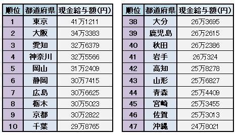 下の2つの表は2009年の現金給与総額(月間の平均、事業所規模は5人以上)です。左の表が上位10県、右の表が下位10県となっています。
