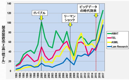 製造装置売上高のトップ4を見てみると、1位の米アプライドマテリアルズ(AMAT)、2位のオランダASML、3位の米ラムリサーチ、そして4位のTEL、全ての企業が2015年以降、猛烈な勢いで売上高を伸ばしていることが分かる(図2)。